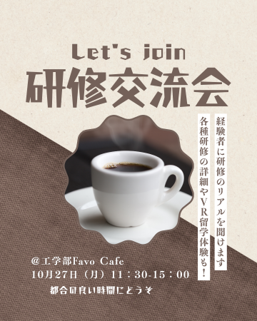 また、工学部の海外留学経験者が留学中の体験を語る海外研修交流会も同時開催します。